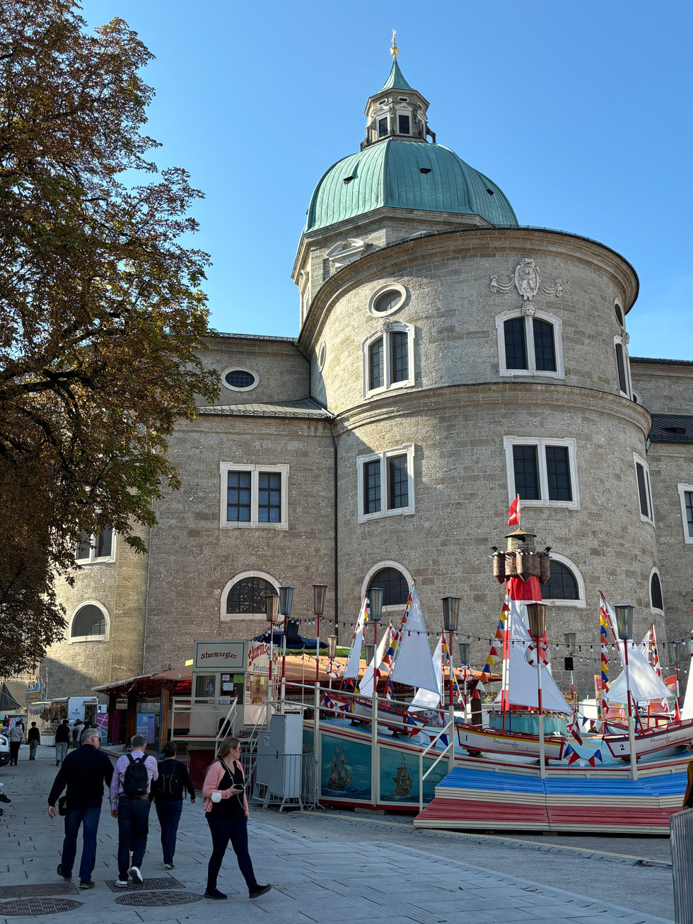 We wandered through Salzburg’s charming, storybook streets, passing by the Church of St. Cajetan — a tranquil baroque sanctuary that radiates quiet reverence. Designed by Italian architect Giovanni Gaspare Zuccalli and constructed between 1685 and 1691 for the Theatine Order, the church brings a touch of Roman grandeur to the heart of the Alps. As we continued, we found ourselves nearing the majestic Salzburg Cathedral, a masterpiece of sacred architecture and the spiritual heartbeat of the city. Revered not only for its stunning baroque design, the cathedral holds special significance as the site of Mozart’s baptism — a moment immortalized just steps away in Mozartplatz, where the composer’s statue stands proudly in the square, watching over the city that gave him to the world.